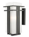 The geometric lines of the Abbey family combine well with contemporary home styling as well as homes in the craftsmen style. This large wall mount fixture is made of steel and finished in black with matte opal glass.