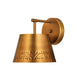 This one-light wall sconce from the Maddox collection creates a seamless, easy-living look for casual spaces in need of extra lighting. Rubbed brass finish iron adds a decadent look to a sconce featuring a conical shade with a texturized hammered belt detail and matching wall mount. Dress up a bathroom or hallway space with this elegant light that incorporates farmhouse and industrial motifs.
