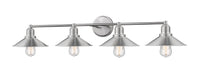 Finish the sophisticated ambiance of a custom designed master en suite with this stylish four-light vanity fixture. A collection of charming hood shades and a mounting bar in brushed nickel finish steel create an ideal host for soft and stylish vintage bulbs.