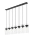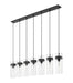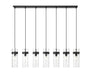 Superb opulence radiates from a modern seven-light linear chandelier. In matte black, it delivers impressive depth and contrast over a kitchen island or dining table, offering clear water glass shades and distinctive metal collars for a clean, precise look and feel. Braided cord completes the look to perfection.