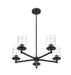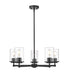Complete a timeless kitchen or living area with the understated flair of a modern five-light chandelier from the impeccable Thayer collection. Clean lines and gentle curves highlight its silhouette, with cylinders of smooth, clear glass surrounding each light and offering a light, airy ambiance over a breakfast nook or entryway. A cool matte black finish adds the perfect touch of sleek sophistication.
