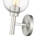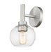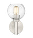 Graceful curves create the perfect circle design elements that define this contemporary one-light wall sconce. Its familiar, torch-inspired silhouette is adorned with a brushed nickel finish for gleaming flair in an entry or living room. An open-edged, clear glass globe shade adds precision to a fixture that can be mounted either up or down to best suit your space and preference.