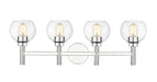 A precise, perfect circle creates the inspirations for the modern ambiance of third contemporary four-light vanity wall light. Designed for the Sutton collection, the sconce showcases four of torch-style lights paired with steel framing and a round wall plate, all in a gleaming chrome finish. A quartet of open-edged globe shades are expertly crafted in thick, clear glass, delivering maximum illumination to your vanity and bathroom space.