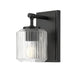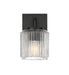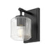 The richness of a matte black finish wall plate and arm contrasts beautifully with ribbed glass in this modern one-light wall sconce. Delivering minimal elegance and refinement, it's a simple, clean design that blends beautifully in traditional, transitional, and contemporary living spaces and baths. The ribbed glass creates a soft, undulating effect, perfect for subtle enhancement.