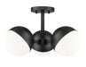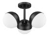 A modern three-light semi-flushmount ceiling light sets a refined, elevated tone in your bedroom or home office. It casts soft, inviting illumination with three opal glass orb shades, each paired with a moveable shield that allows you to your customize its look. The fixture receives a matte black finish, offering optimal contrast and depth to your charming space.