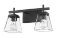 Long, lean lines encourage the clean, simple precision of this modern two-light vanity sconce. Perfect for delivering bright, direct illumination, the sconce features a pair of flared shades, each crafted in clear glass and perched within a matte black finish frame. Mount this sconce with lights up or down to create a spa-like bathroom ambiance.