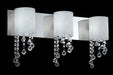 Crystal bead droplets shimmer against chrome hardware on this three light vanity, diffusing the light from the warm matte opal shades.