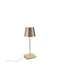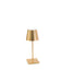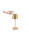 Battery-operated and rechargeable portable table lamp. The lamp features dimming touch control and has 3-CCT color temperature selection for 2200K (candle light), 2700K (warm white), and 3000K (cool white). The integrated LED module is designed and engineered to produce controlled downlight and a gentle uplight glow Features LED light with polycarbonate diffuser 9+ hours cordless illumination Touch dimmer control Indoor/outdoor use (powder-coated finishes) Rechargeable battery Contact charging base included 2-year warranty Specifications 188 lumens, 2700K LED/CRI>,80/120 volt/2.2w 3 color temperature settings: 2200K / 2700K / 3000K 4.3" sq. base x 11.8" height IP54 rating protection Die-cast aluminum body Powder-coated or metal-leaf finish Weight 3 lbs. Instructions To recharge your Poldina Pro Mini lamp, plug the provided charging base into an outlet and place the lamp on the base. The translucent top will glow red while charging and turn green once the charging cycle is complete. A full charge takes around 6 hours. The fully charged lamp may remain on the charging cradle without damaging the battery.